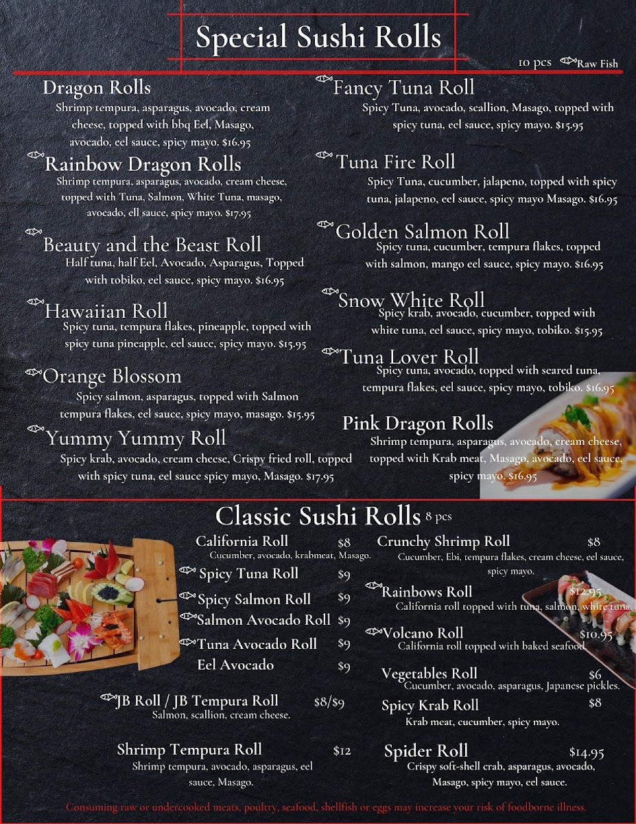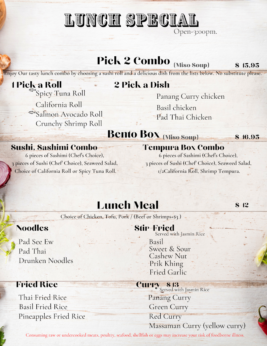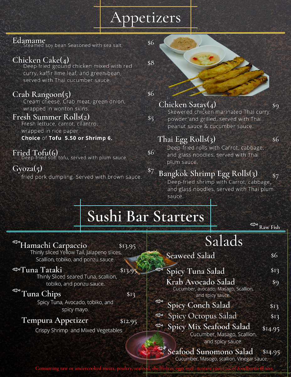 Guests can expect comforting staples like Chicken Pad Thai and Pineapple Curry, complemented by interesting sushi rolls such as the Golden Salmon Roll and Rainbow Roll. Appetizers like Crab Rangoon and Fresh Summer Rolls provide lighter bites perfect for starting a meal or enjoying alongside a cold Thai Tea or a sweet dessert like Blue Sticky Rice with Mango.